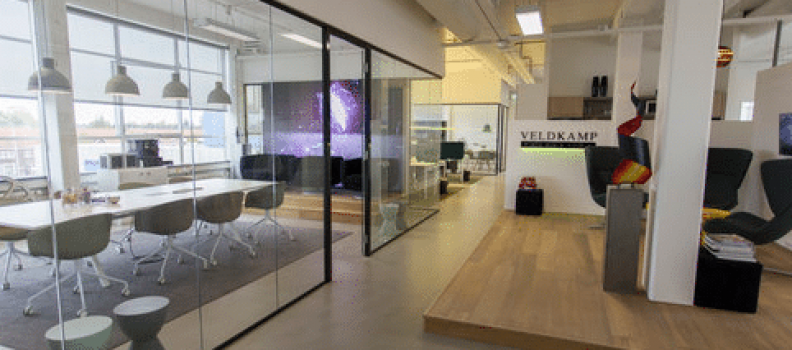 Welkom bij Veldkamp Produkties! Als u de tweede verdieping van ons pand bereikt en u doorloopt naar achteren, is dit het eerste beeld dat u van ons kantoor heeft. De presentatieruimte waar we onze gasten ontvangen aan de linkerkant; een wachtruimte aan de rechterkant. U hoeft zich hier niet te vervelen: onze showreel staat hier de hele dag aan in een loop!
