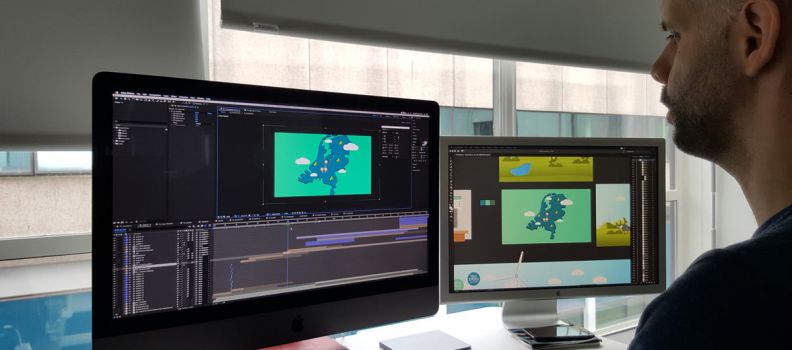 In het geval van een voice over werkt het anders. Edwin heeft de voice over al tijdens de offline montage ingesproken. De voice over van Edwin gebruikt Hans om het tempo en de lengte van de animatie te bepalen. Dit is onmisbaar voor een goed montageproces. ‘Deze gebruik ik om de timing van de video en de animatie op aan te passen. Zodra dit allemaal piekfijn klopt, wordt de animatie aan de klant gestuurd. Zodra de klant een voice over stem heeft geselecteerd plaatsen we deze eronder. Na een final check wordt de video animatie aan de klant gepresenteerd. Het meest spannende moment om naar uit te kijken.